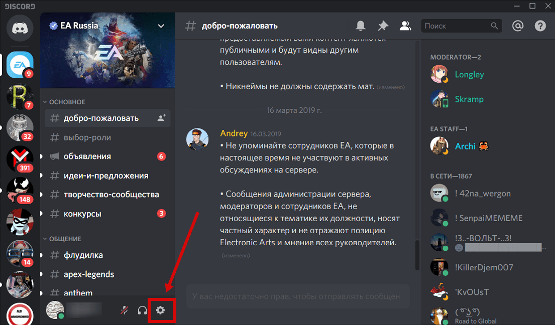 2. Посмотрите в низ экрана. Слева расположены маленькие значки с изображением микрофона, наушников и шестеренки. Убедитесь в том, что они не отключены. Если иконка перечеркнута красным, кликните по ней, чтобы запустить соответствующее оборудование.